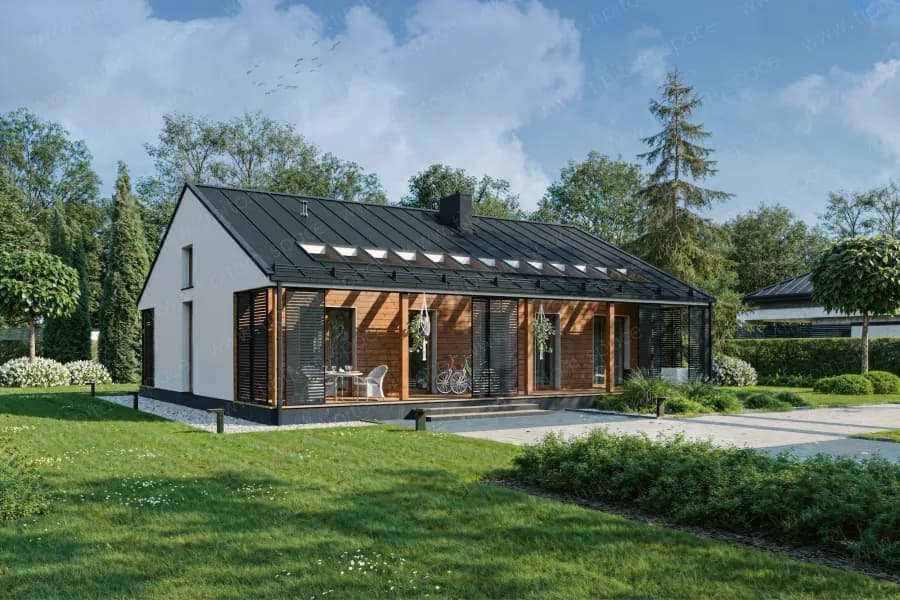 Dom jednorodzinnySamodzielny, wolnostojący budynek w technologii murowanej na rzucie prostokąta, przekryty dachem dwuspadowym. Wkomponowany w bryłę budynku od frontu jak i od strony ogrodowej taras z zadaszeniem stanowiącym przedłużenie głównej połaci dachu pozwala na uzyskanie przyjemnej i komfortowej strefy wypoczynkowej asymilującej wnętrze budynku z otoczeniem. Wrażenie przestronności potęguje wysoka przestrzeń części dziennej od podłogi po sam dach z wyeksponowanymi elementami konstrukcji więźby dachowej. Budynek na kondygnacji parteru posiada część dzienną z aneksem kuchennym oraz 3 pokoje możliwe do zaaranżowania zgodnie z zapotrzebowaniem i indywidualnymi preferencjami. Ponadto mamy do dyspozycji węzeł sanitarny i zaplecze techniczne, w skład którego wchodzi kotłownia.