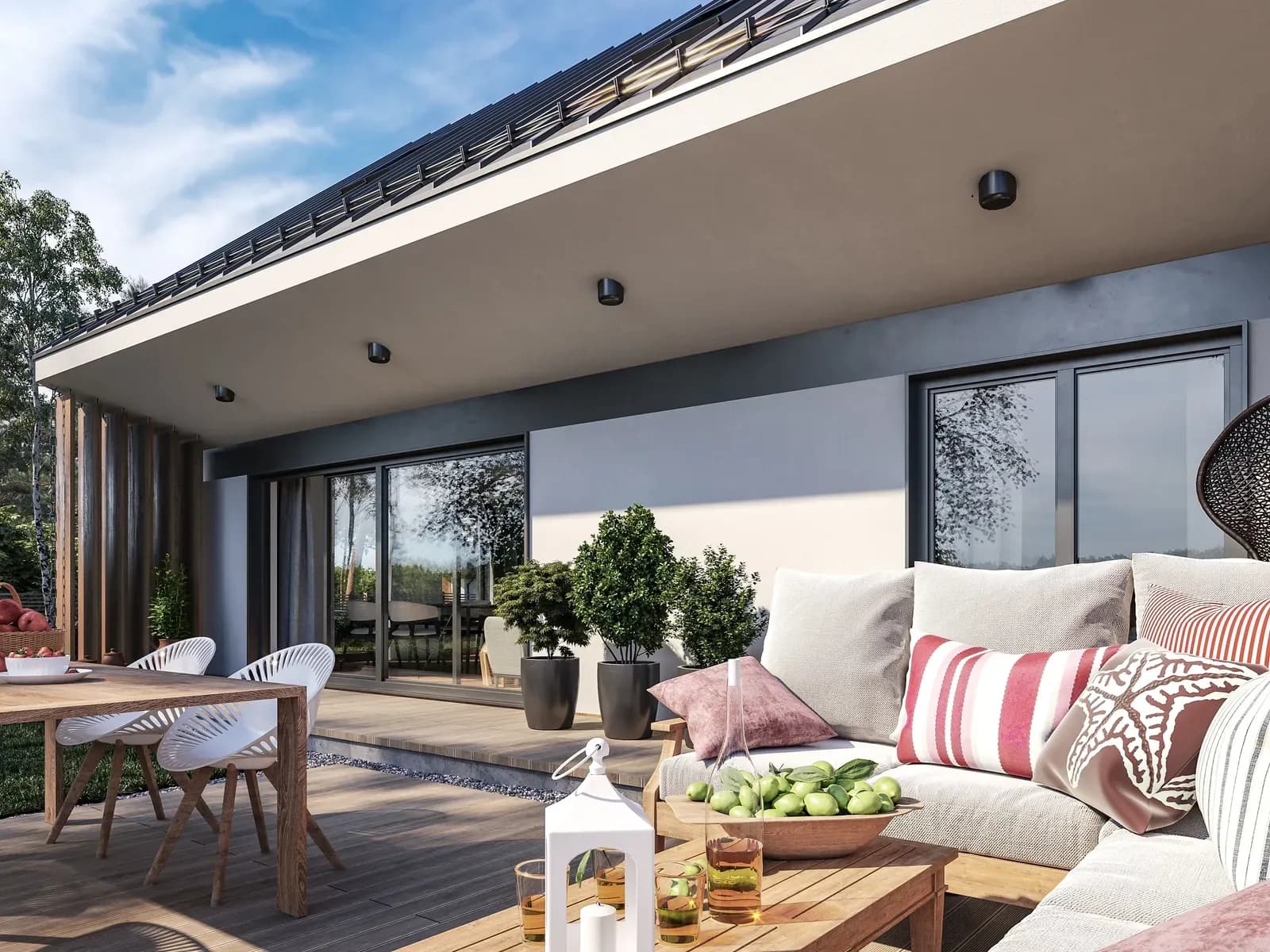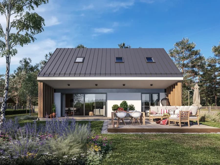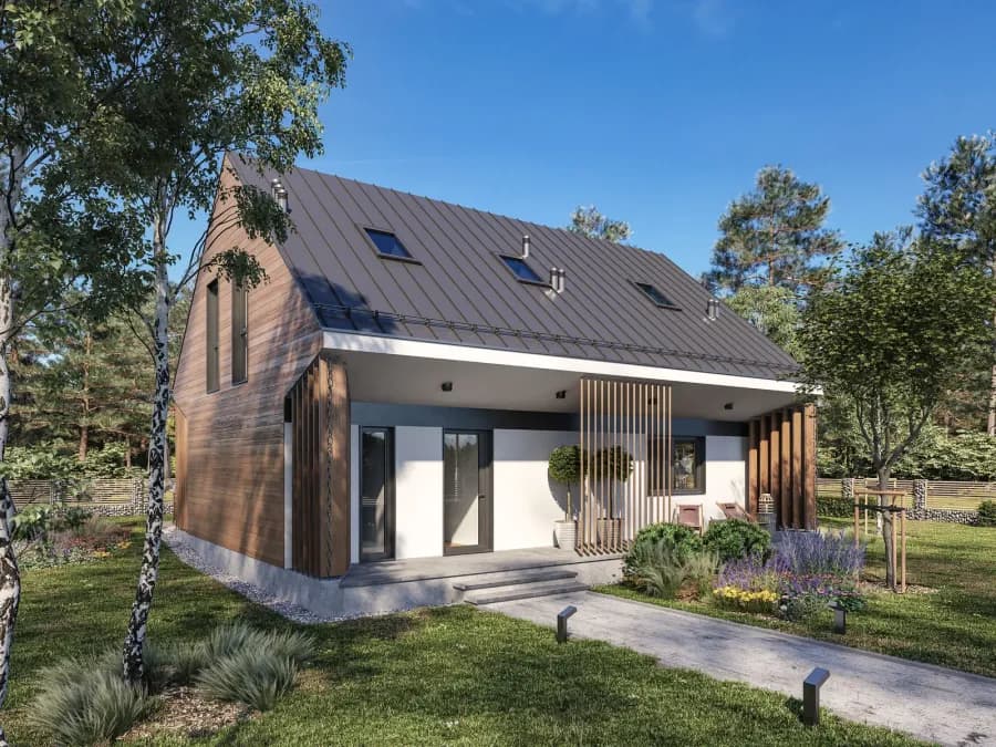 Dom jednorodzinnyOryginalna forma to połączenie dwóch kontrastujących stylów łącząca tradycyjne dachy okapowe ze współczesnymi trendami bezokapowymi. Zabieg ten pozwolił na uzyskanie przekrycia dwóch tarasów części wejściowej i wypoczynkowej w głównej bryle budynku bez potrzeby stosowania dodatkowych elementów takich jak pergole, markizy i parasole. Junior to strzał w dziesiątkę dla wszystkich, którzy cenią sobie funkcjonalność połączoną z ekonomią.
