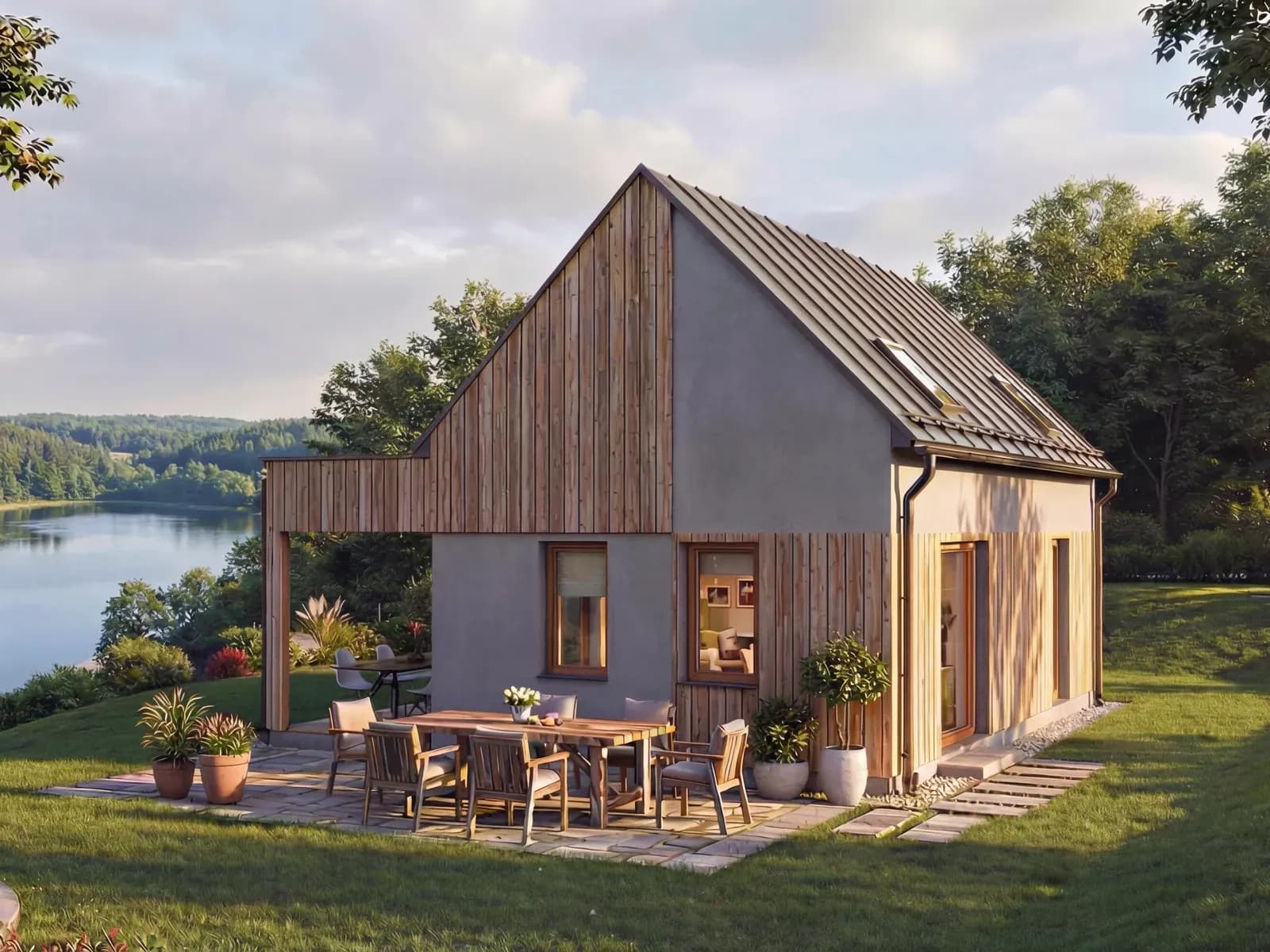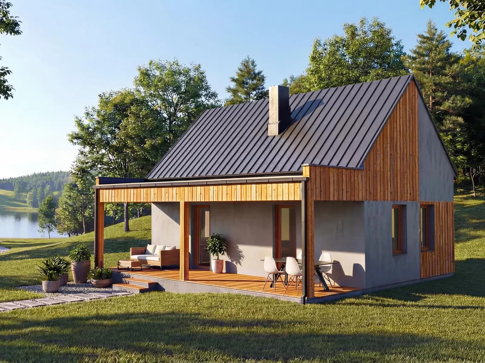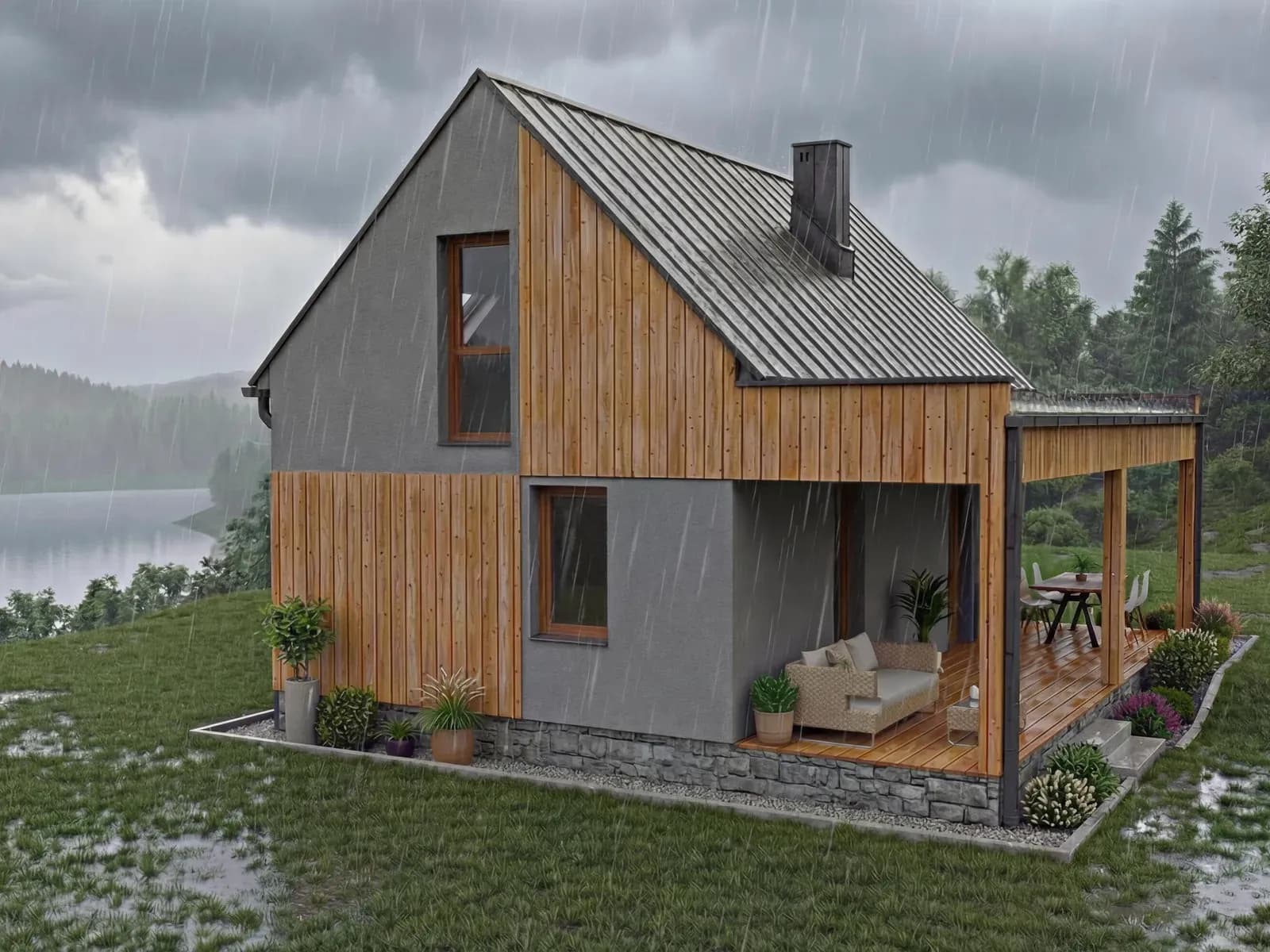 Dom jednorodzinnyNa parterze znajduje pokój dzienny z aneksem kuchennym, dwie niezależna sypialnia oraz łazienka. Na poddaszu znajdują się dwa pokoje sypialne do której prowadzą wygodne schody z salonu oraz łazienka. W pokoju dziennym jest zaprojektowane miejsce na piec opalany drewnem “koza”, która może być typowa lub z wężownicą. W naszych budynkach staramy się projektować systemy ogrzewania typu hybrydowego, czyli dwa niezależne źródła ogrzewania.