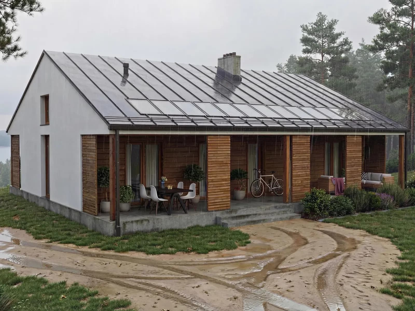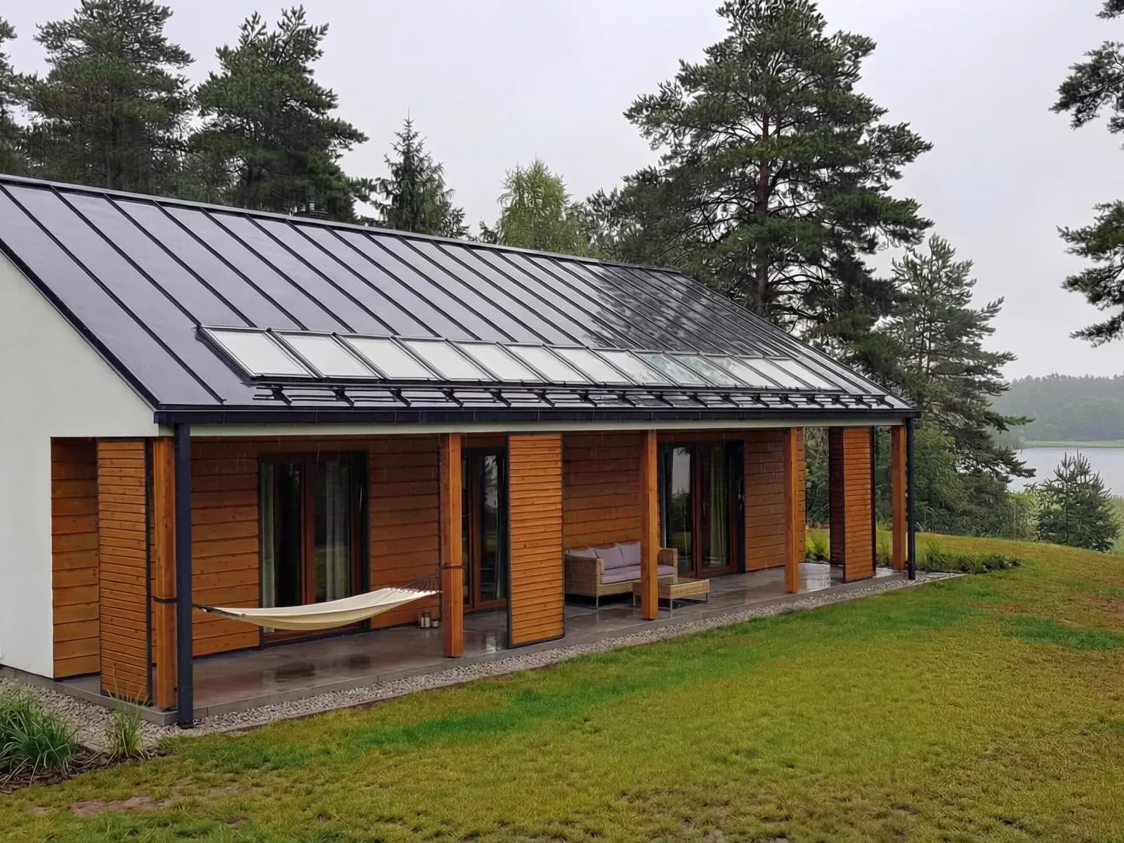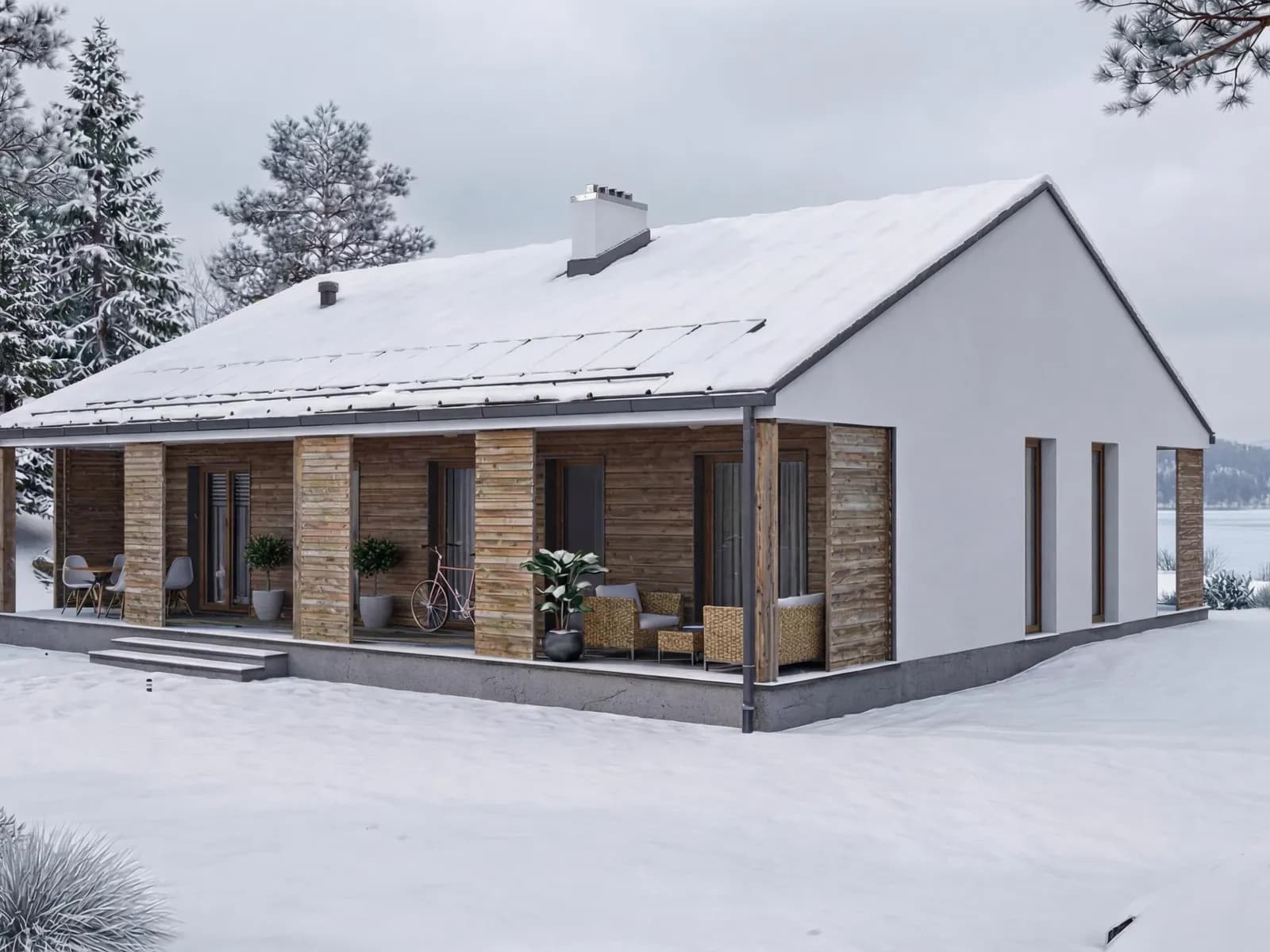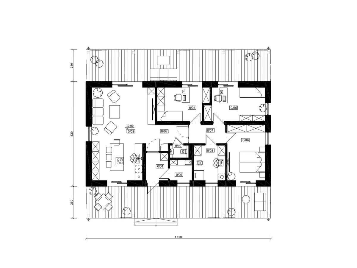 Dom jednorodzinnyWkomponowany w bryłę budynku od frontu jak i od strony ogrodowej taras z zadaszeniem stanowiącym przedłużenie głównej połaci dachu pozwala na uzyskanie przyjemnej i komfortowej strefy wypoczynkowej asymilującej wnętrze budynku z otoczeniem.