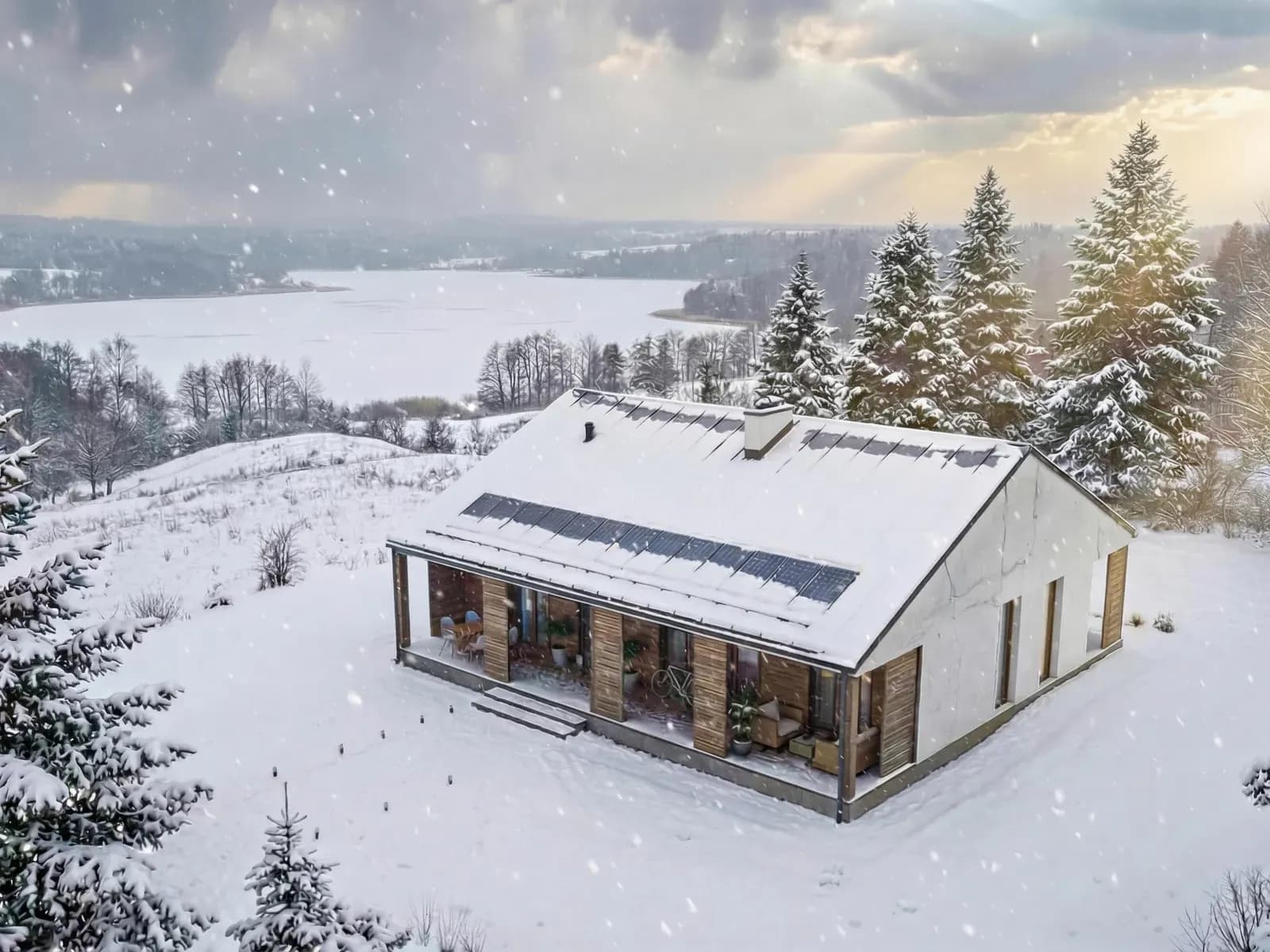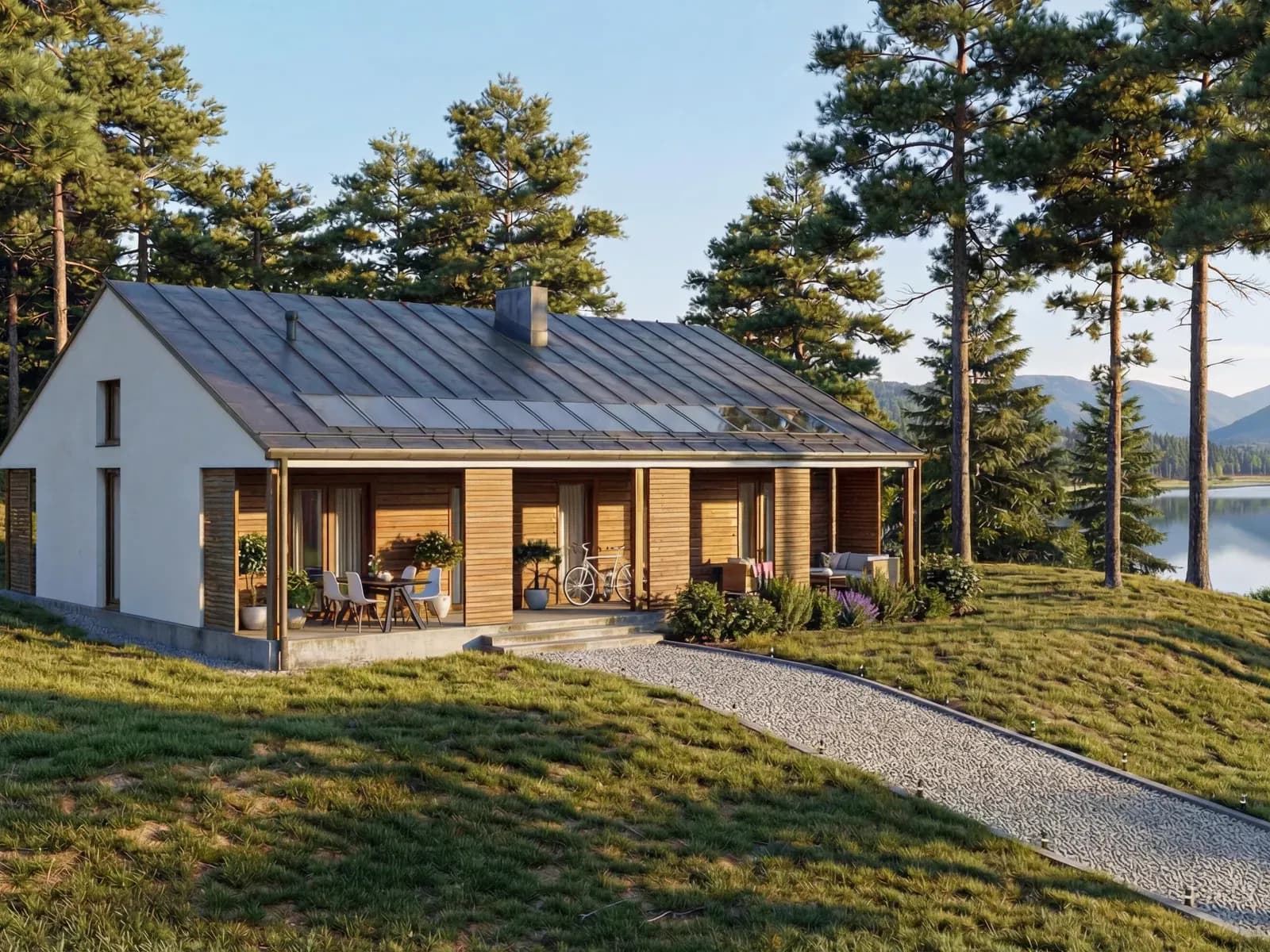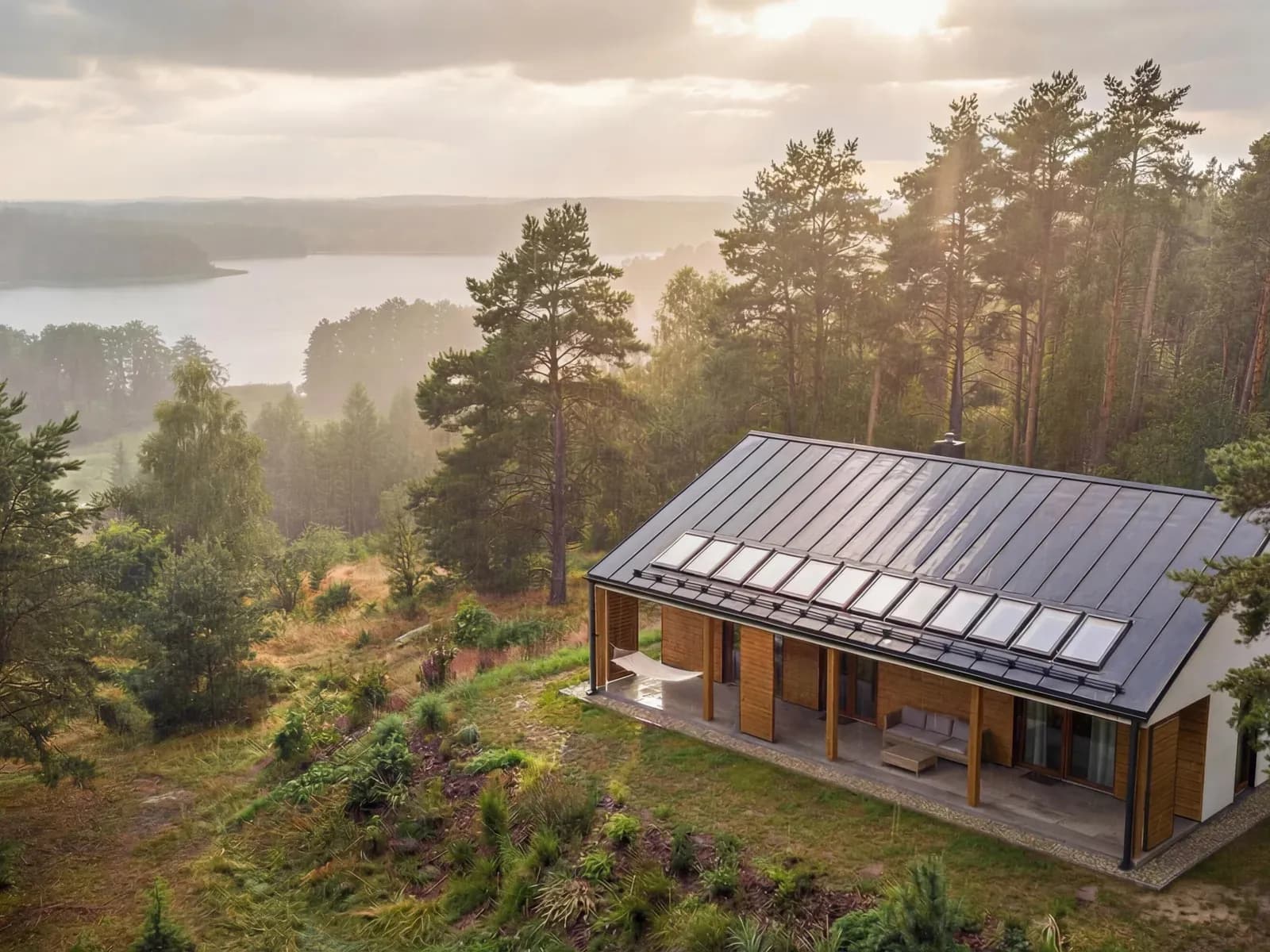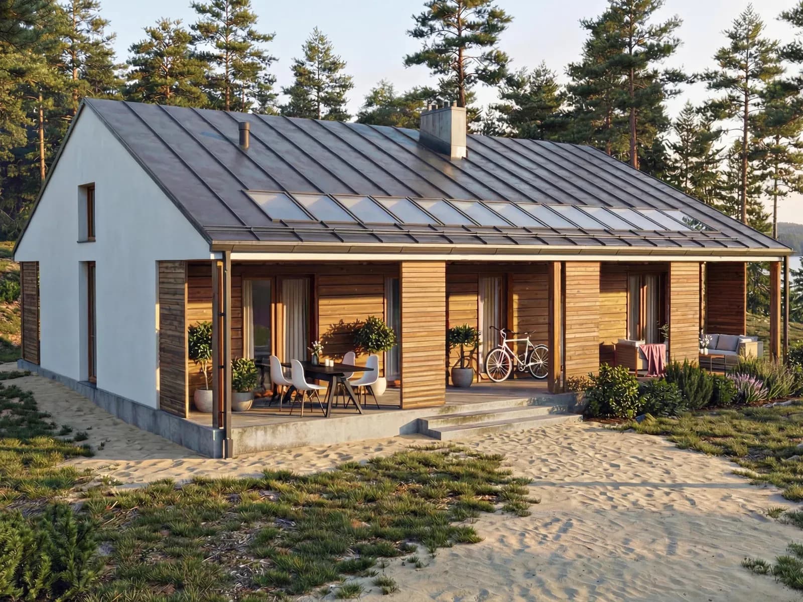 Dom jednorodzinnyWkomponowany w bryłę budynku od frontu jak i od strony ogrodowej taras z zadaszeniem stanowiącym przedłużenie głównej połaci dachu pozwala na uzyskanie przyjemnej i komfortowej strefy wypoczynkowej asymilującej wnętrze budynku z otoczeniem.