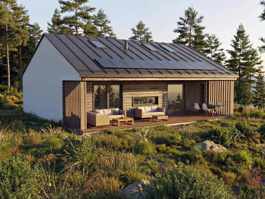 Dom jednorodzinnyWkomponowany w bryłę budynku taras z zadaszeniem stanowiącym przedłużenie głównej połaci dachu pozwala na uzyskanie przyjemnej i komfortowej strefy wypoczynkowej asymilującej wnętrze budynku z otoczeniem. Wrażenie przestronności potęguje wysoka przestrzeń części dziennej od podłogi po sam dach z wyeksponowanymi elementami konstrukcji więźby dachowej.