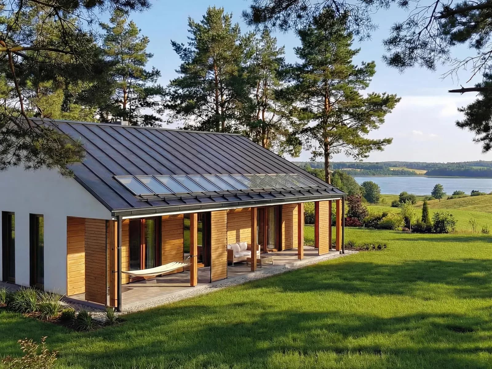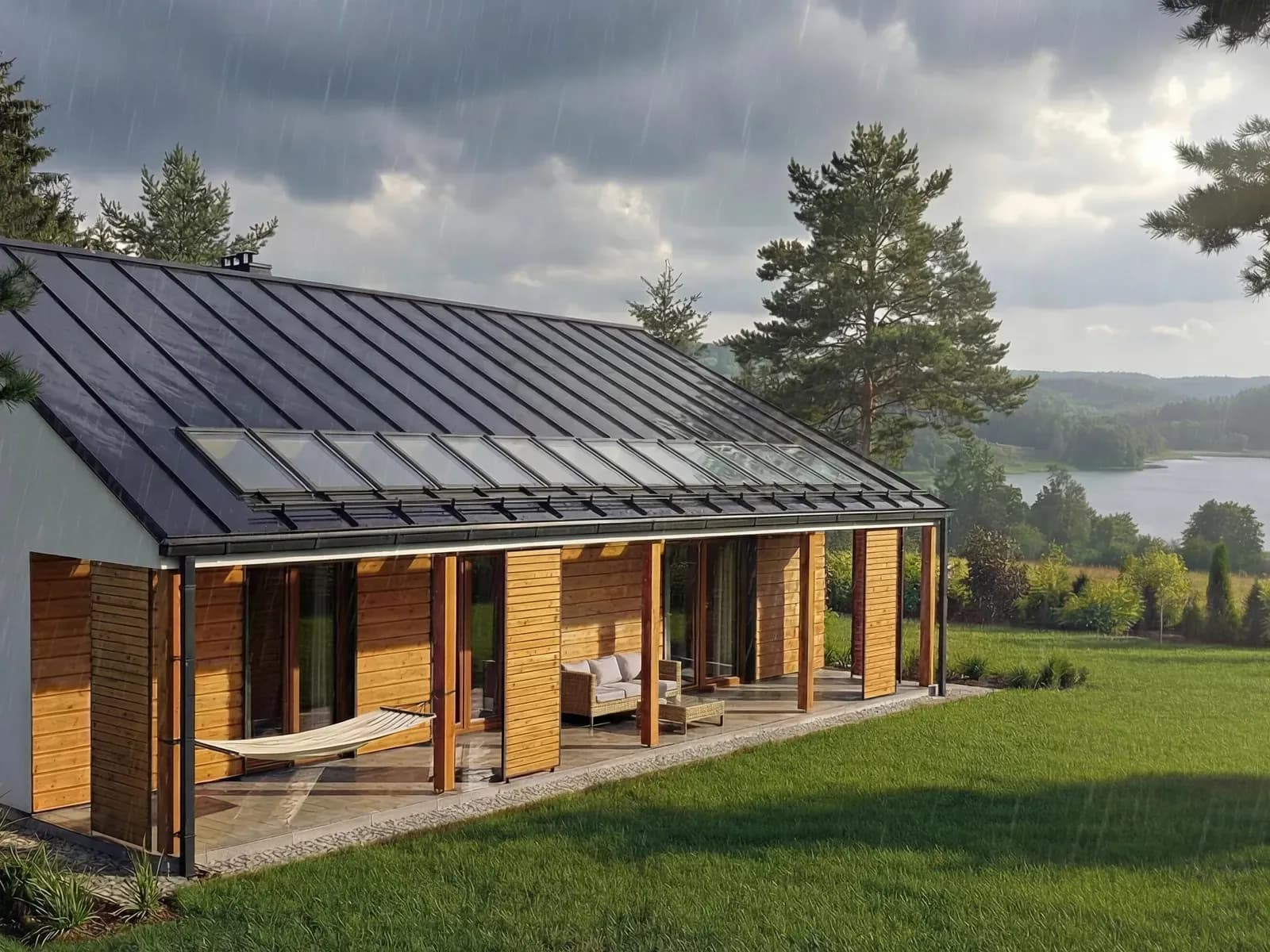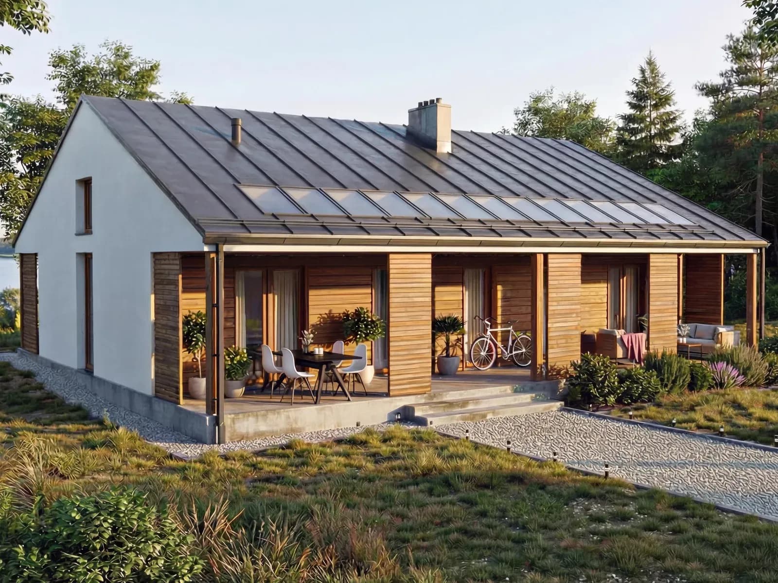 Dom jednorodzinnyWkomponowany w bryłę budynku od frontu jak i od strony ogrodowej taras z zadaszeniem stanowiącym przedłużenie głównej połaci dachu pozwala na uzyskanie przyjemnej i komfortowej strefy wypoczynkowej asymilującej wnętrze budynku z otoczeniem.
