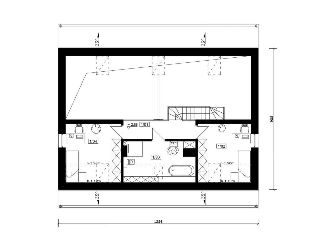 Na poddaszu znajdziemy 2 dodatkowe pokoje oraz łazienkę.