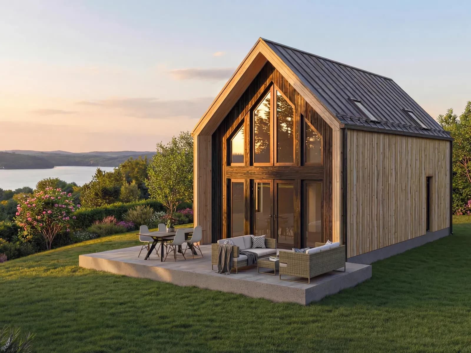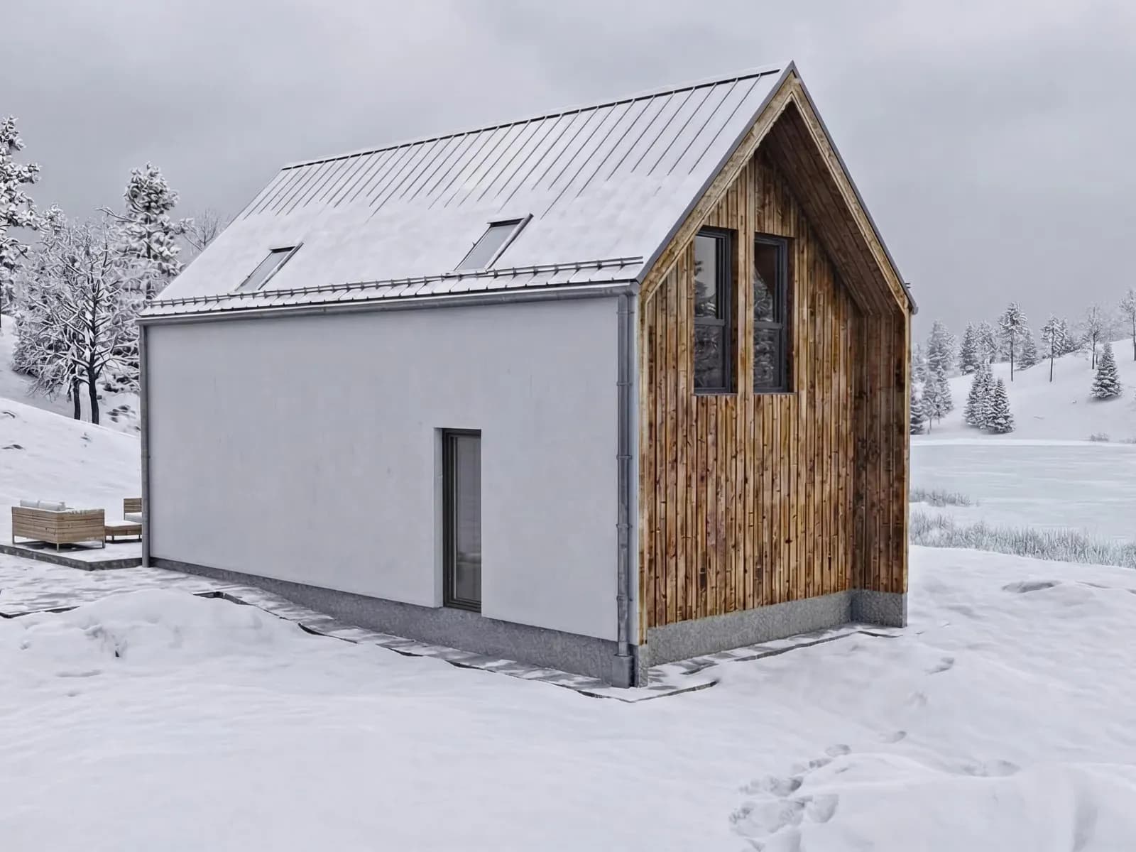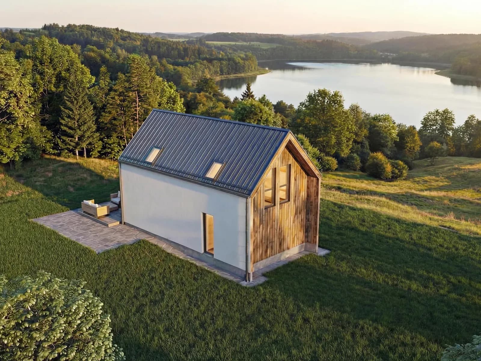 Dom jednorodzinnySamodzielny, wolnostojący budynek w technologii drewnianej szkieletowej na rzucie prostokąta, przekryty dachem dwuspadowym z oknami połaciowymi doświetlającymi pokój dzienny i antresole.